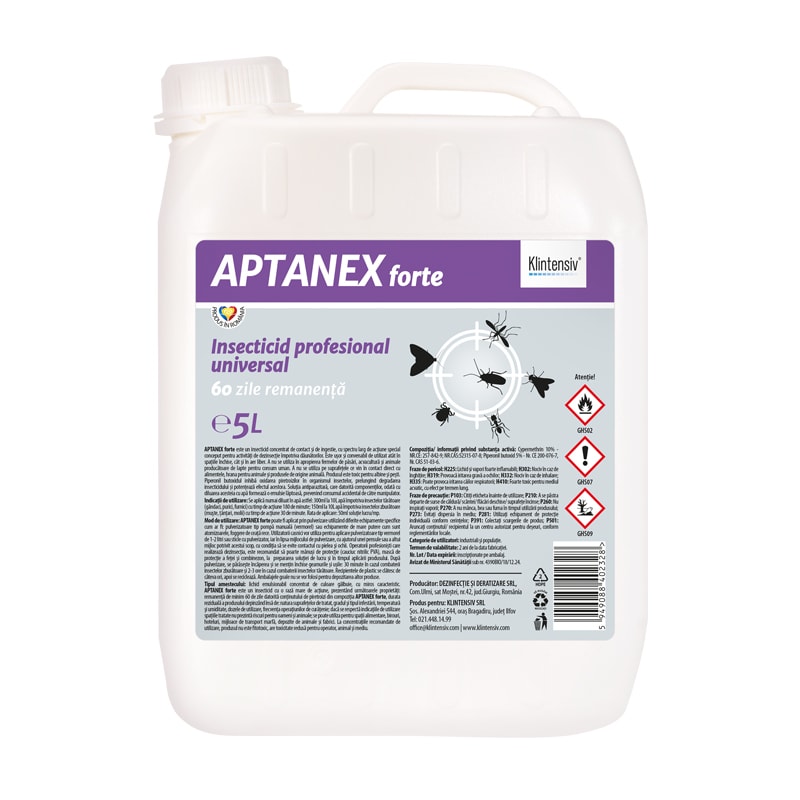 APTANEX este un produs cu o eficacitate ridicata, ideal în combaterea insectelor de disconfort zburătoare si târâtoare, dintre care gandaci, plosnite, purici, muste, tantari, molii, capuse, termite, acarieni, paianjeni, furnici,