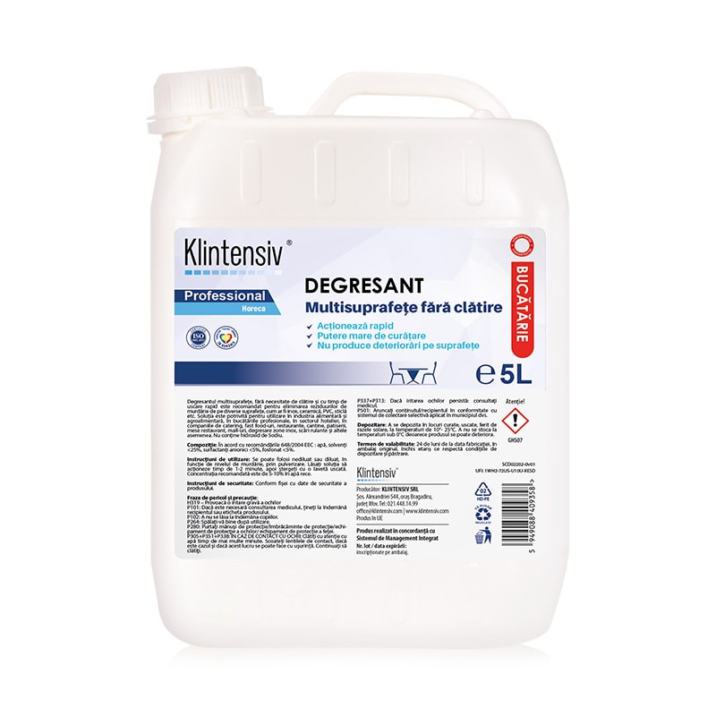 Degresantul multisuprafețe, fără necesitate de clătire și cu timp de uscare rapid este recomandat pentru eliminarea reziduurilor de murdărie de pe diverse suprafețe, cum ar fi inox, ceramică, PVC, sticlă etc. Soluția este potrivită pentru utilizare în industria alimentară și agroalimentară, în bucătăriile profesionale, în sectorul hotelier, în companiile de catering, fast food-uri, restaurante, cantine, patiserii, mese restaurant, mall-uri, degresare zone inox, scări rulante și altele asemenea. Nu conține hidroxid de Sodiu.