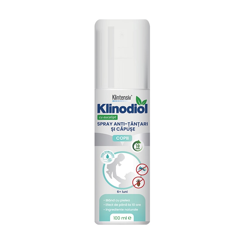KLINODIOL SPRAY pentru copii este un repelent anti țânțari și capușe, sub forma de lichid, cu efect de pâna la 10 ore de la aplicare.